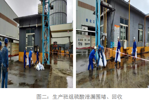 本次演練模擬硫酸卸車泵房硫酸管道泄漏,14:00當(dāng)班兩名酸堿工巡查酸堿管網(wǎng)時發(fā)現(xiàn)酸堿卸車區(qū)閥門滲漏;現(xiàn)場人員立即通知當(dāng)班班長,班長立即組織人員準(zhǔn)備急救物資;14:02當(dāng)班班長趕到現(xiàn)場查看滲漏情況后立即組織人員用應(yīng)急沙進(jìn)行圍堵并安排人員拉好警戒線維持好現(xiàn)場次序;14:03當(dāng)班班長將情況匯報調(diào)度室,同時通知檢修到場,調(diào)度室第一時間通知安全環(huán)保科;14:05檢修到現(xiàn)場確認(rèn)情況,制定出檢修方案并開始檢修,同時現(xiàn)場監(jiān)護(hù)人員確認(rèn)檢修防護(hù)用品是否穿戴完整;14:15經(jīng)過檢修搶修后現(xiàn)場試車確認(rèn),無滲漏,匯報相關(guān)領(lǐng)導(dǎo)同時把地面污染物進(jìn)行清理;14:25經(jīng)過相關(guān)領(lǐng)導(dǎo)確認(rèn)后,無滲漏,同意恢復(fù)生產(chǎn);14:28匯報調(diào)度,調(diào)度室通知恢復(fù)正常生產(chǎn)。